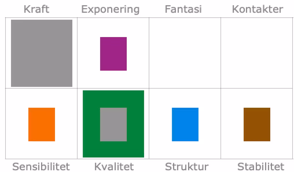 Under mötet fintrimmas ditt testresultat, så det verkligen visar din personlighet i ett "nötskal". Du ser det bland annat genom att det blir en ranking mellan dina starkaste faktorer– de med helt färgifylld ruta. Dim starkaste faktor (drivkraft) – kärnfaktorn ser du i exemplet genom att Kvalitet har en grå ruta i den gröna rutan. Det betyder att din näst starkaste faktorn – andrafaktorn – är Kraft. Det här exemplet säger att den här personens agerande styrs mest av Kvalitet och Kraft. Det är de viktigaste styrkorna för X. En viktig konsekvens av det är att om X har ett jobb, där dessa faktorer inte passar in, så blir X olycklig i längden att ha det jobbet.... När man har en väldigt god matchning, dvs högt Passionindex enligt vår metodik, så kan man nästan se jobbet som en hobby🌈